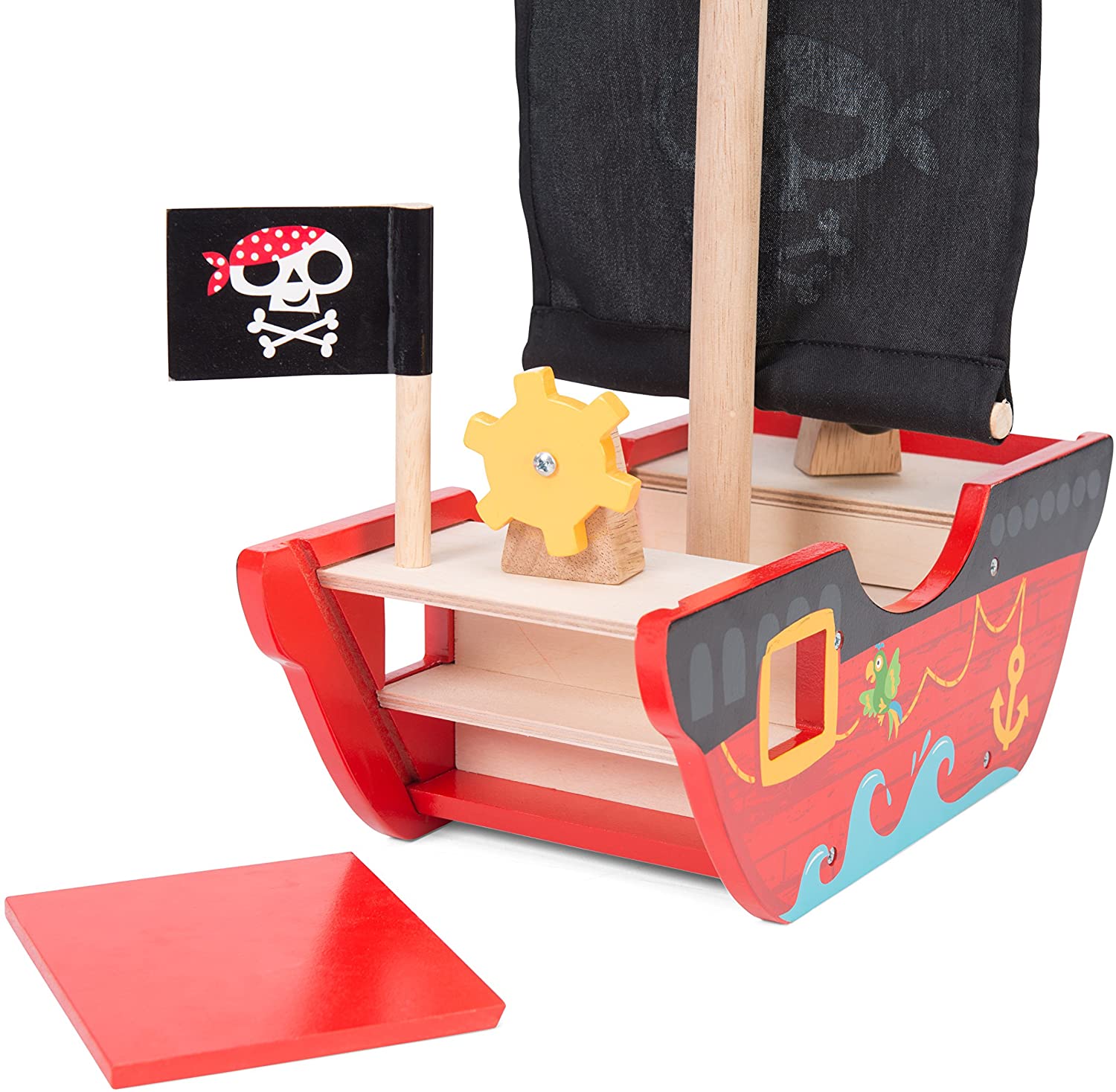 - Cuenta con una vela de tela con un diseño de Jolly Roger, una bandera, un cañón de juguete, un timón giratorio y paneles deslizantes.