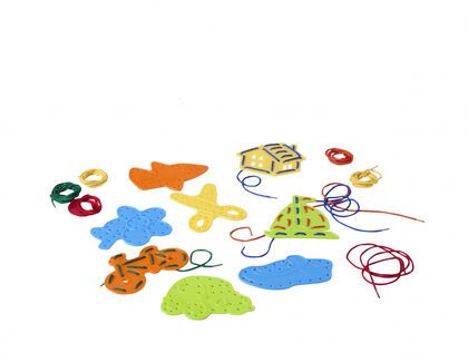 Figuras de plástico flexible para cosido que representan objetos comunes, que resultarán muy atractivas para la realización de ejercicios de cosido.